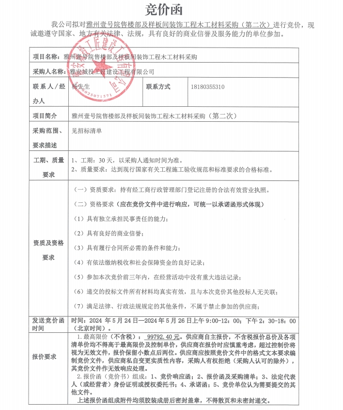 競價函-木工材料采購-雅州壹號院售樓部及樣板間
