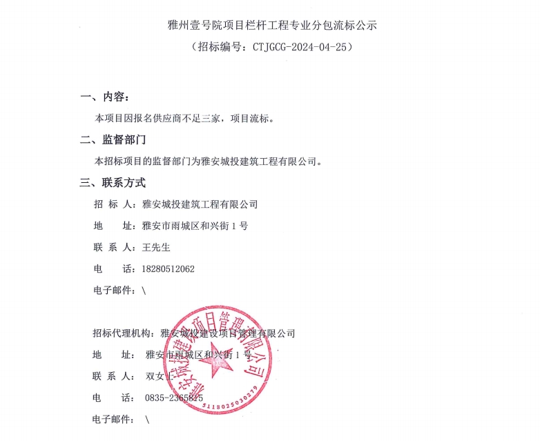 雅州壹號(hào)院項(xiàng)目欄桿工程專(zhuān)業(yè)分包流標(biāo)公示