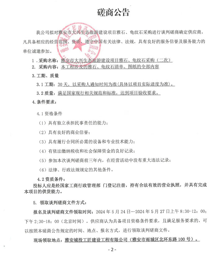 雅安市大興生態(tài)旅游建設(shè)項(xiàng)目雅石、龜紋石(二次)采購(第二次)磋商公告