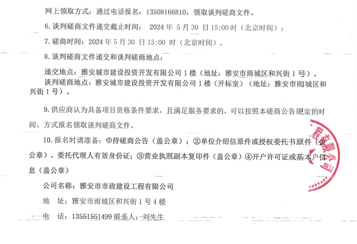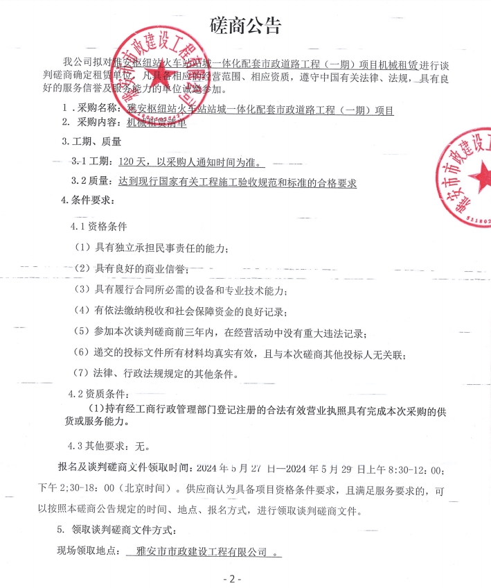 雅安樞紐站火車站站城一體化配套市政道路工程(一期)項目機(jī)械租賃磋商公告