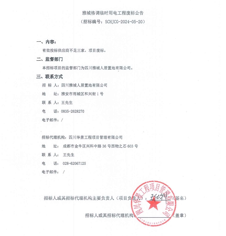 雅城格調(diào)臨時(shí)用電工程廢標(biāo)公告