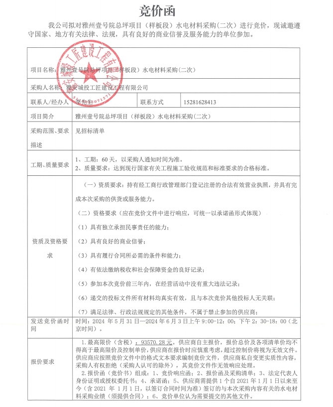 競價(jià)函-雅州壹號(hào)院總坪項(xiàng)目(樣板段)水電材料采購