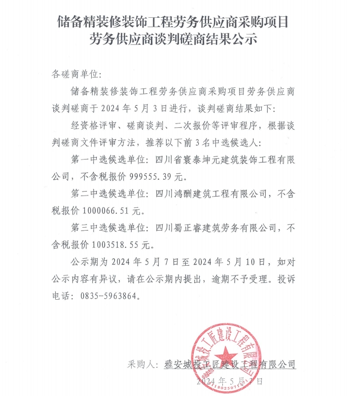 儲備精裝修裝飾工程勞務供應商采購項目勞務供應商談判磋商結(jié)果公示