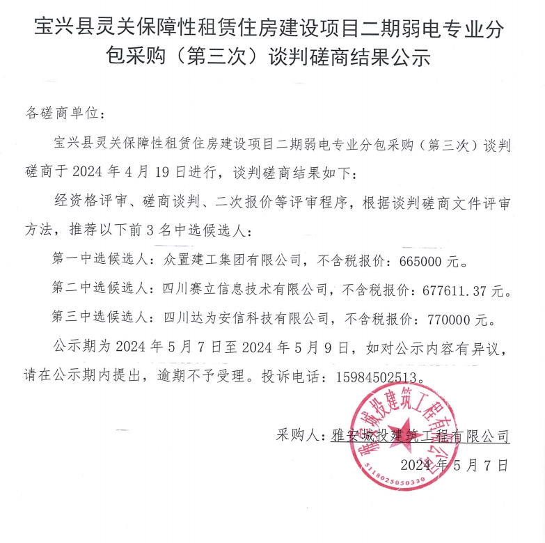 寶興縣靈關(guān)保障性租賃住房建設(shè)項(xiàng)目二期弱電專業(yè)分包采購(第三次)談判磋商結(jié)果公示