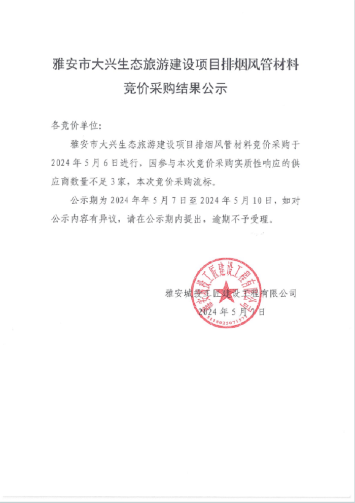 雅安市大興生態(tài)旅游建設(shè)項(xiàng)目排煙風(fēng)管材料競(jìng)價(jià)采購結(jié)果公示