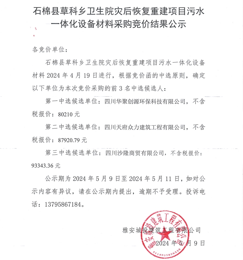 石棉縣草科鄉(xiāng)衛(wèi)生院災后恢復重建項目污水一體化設備材料采購競價結果公示