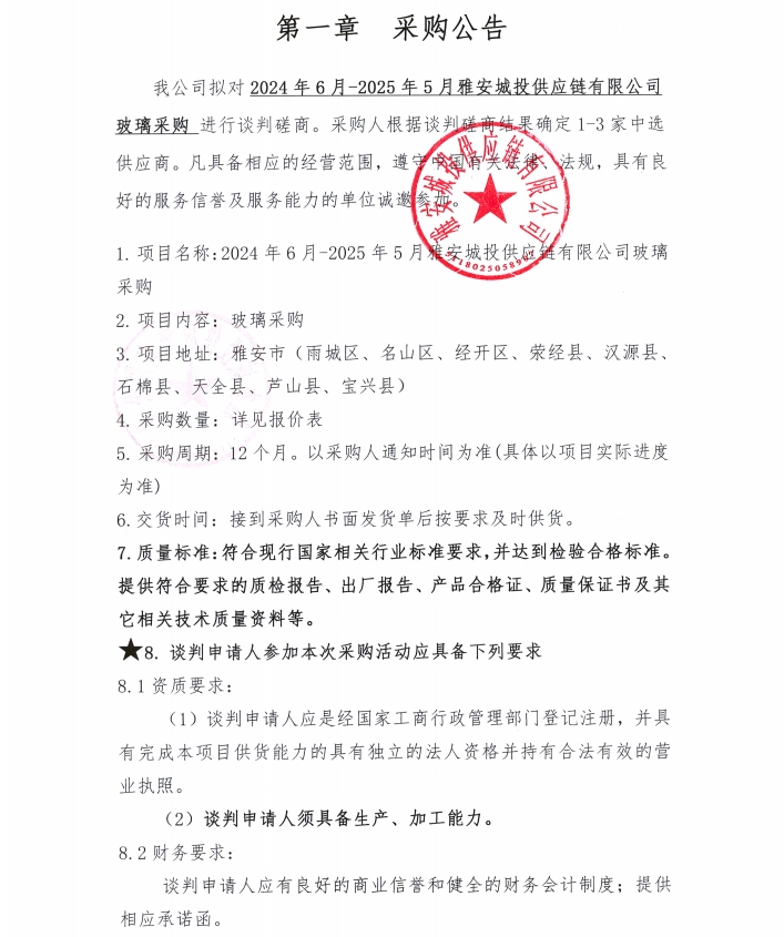 2024年6月-2025年5月雅安城投供應(yīng)鏈有限公司玻璃采購(gòu)公告
