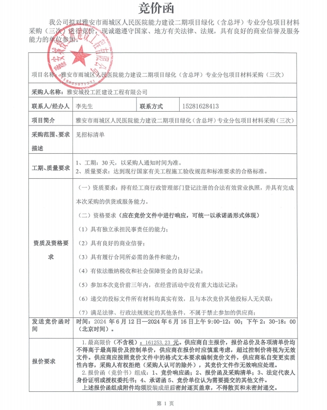 雅安市雨城區(qū)人民醫(yī)院能力建設(shè)二期項(xiàng)目綠化(含總坪)專(zhuān)業(yè)分包項(xiàng)目材料采購(gòu)(三次)競(jìng)價(jià)公告
