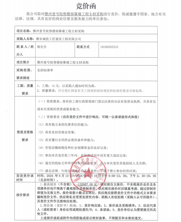 雅州壹號(hào)院售樓部幕墻工程主材采購競(jìng)價(jià)公告