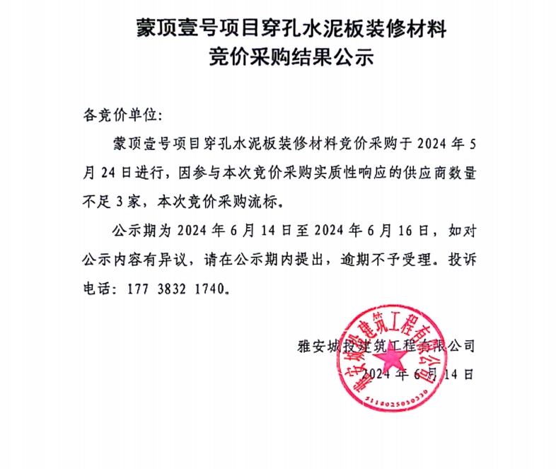 蒙頂壹號(hào)項(xiàng)目穿孔水泥板裝修材料競價(jià)采購結(jié)果公示