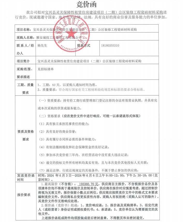 寶興縣靈關(guān)保障性租賃住房建設(shè)項(xiàng)目(二期)公區(qū)裝修工程瓷磚材料采購競(jìng)價(jià)公告