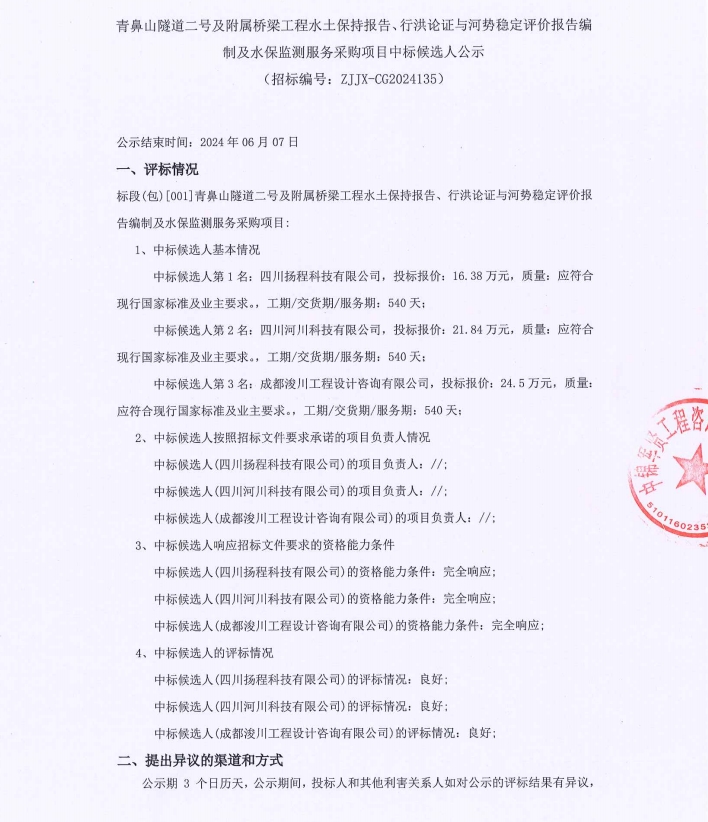 青鼻山隧道二號及附屬橋梁工程水土保持報告、行洪論證與河勢穩(wěn)定評價報告編制及水保監(jiān)測服務采購項目中標候選人公示
