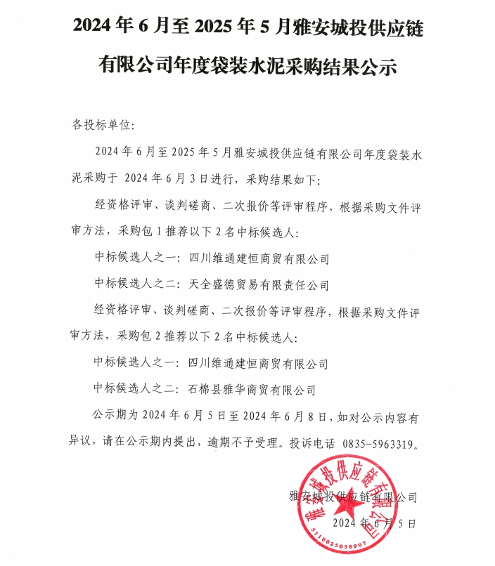 2024年6月至2025年5月雅安城投供應(yīng)鏈有限公司年度袋裝水泥采購(gòu)結(jié)果公示