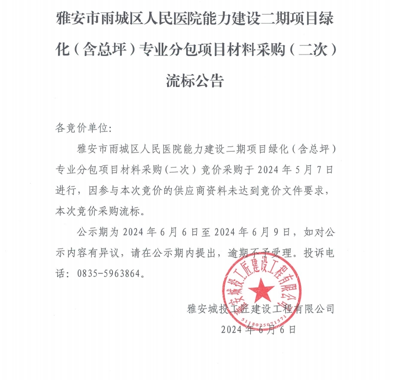 雅安市雨城區(qū)人民醫(yī)院能力建設(shè)二期項目綠化(含總坪)專業(yè)分包材料采購(二次)流標公告