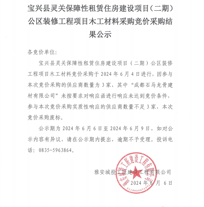 寶興縣靈關保障性租賃住房建設項目(二期)公區(qū)裝修工程項目木工材料采購競價采購結果公示