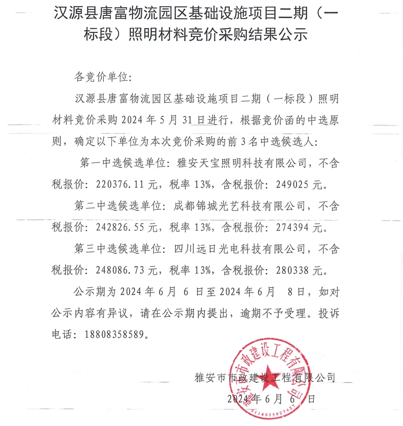 漢源縣唐富物流園區(qū)基礎設施項目二期(一標段)照明材料競價采購結果公示
