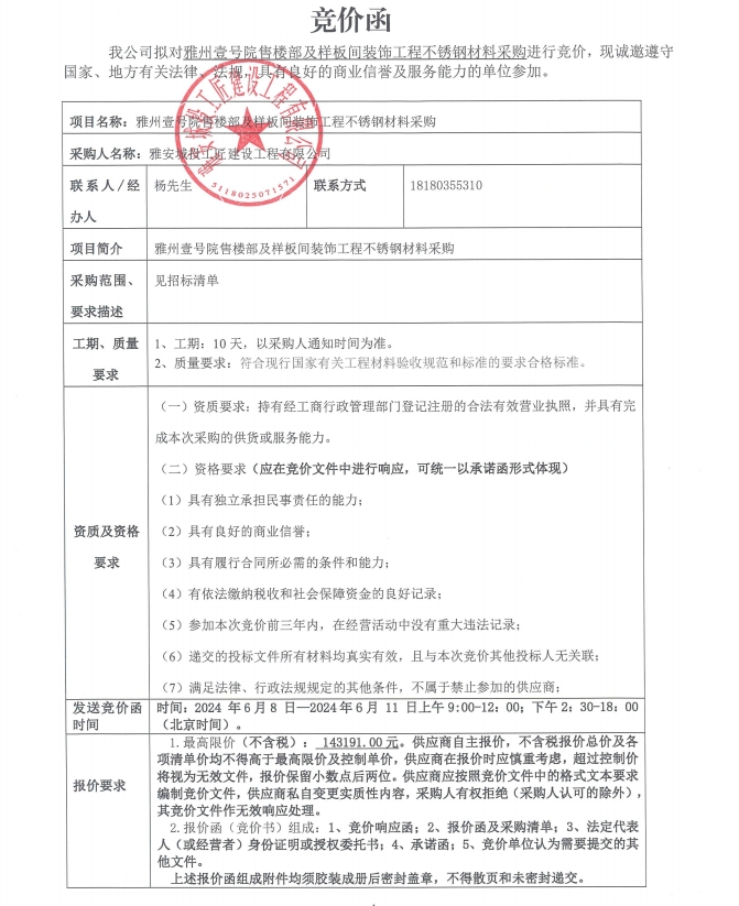 雅州壹號(hào)院售樓部及樣板間裝飾工程不銹鋼材料采購競(jìng)價(jià)公告