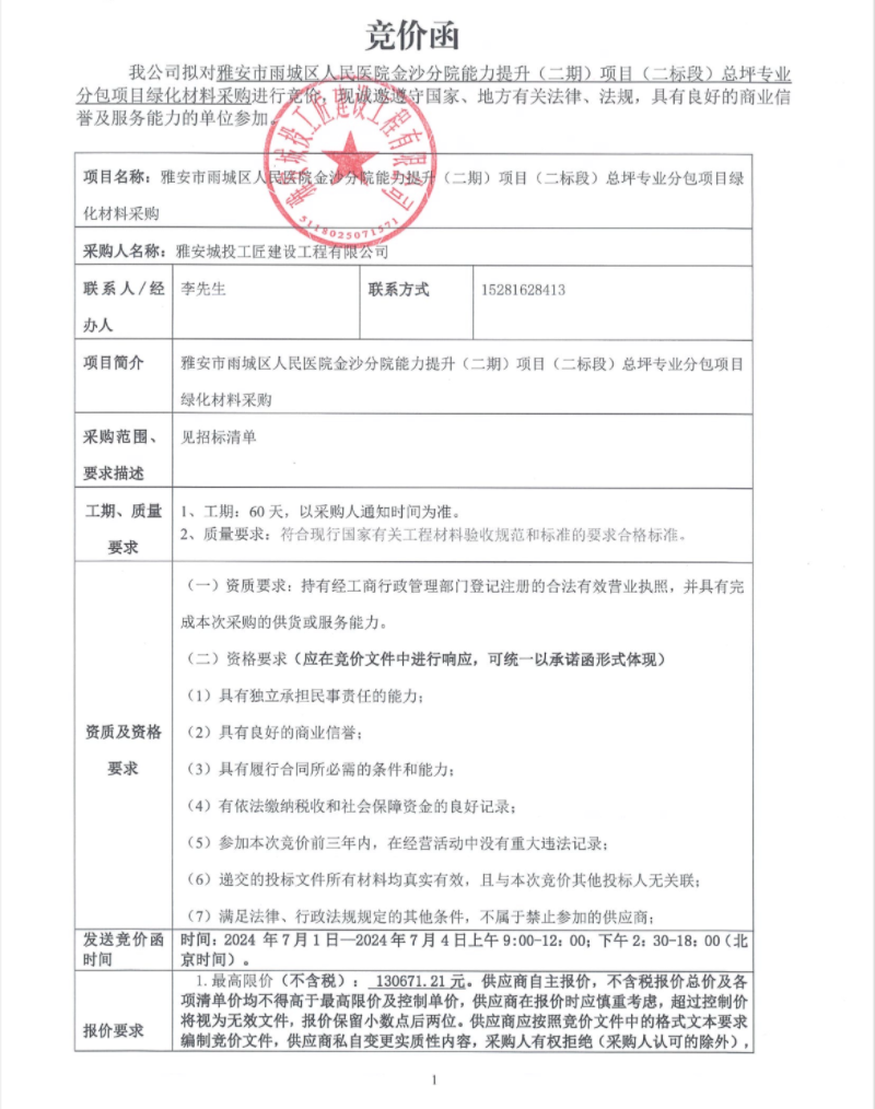 雅安市雨城區(qū)人民醫(yī)院金沙分院能力提升(二期)項目(二標(biāo)段)總坪專業(yè)分包項目綠化材料采購競價公告