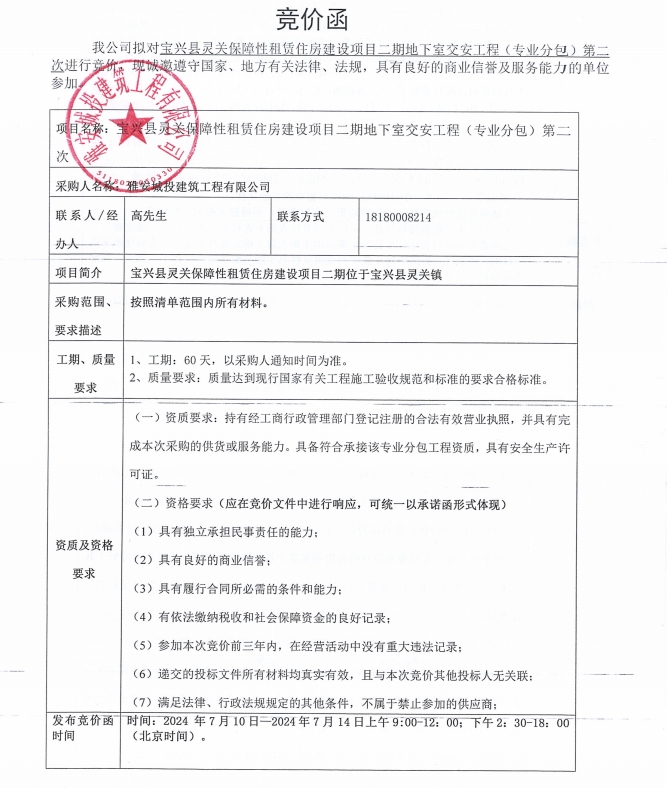 寶興縣靈關(guān)保障性租賃住房建設(shè)項(xiàng)目二期地下室交安工程(專業(yè)分包)第二次競(jìng)價(jià)公告