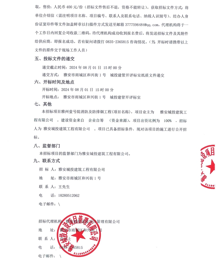 雅州壹號院項目消防及防排煙通風(fēng)工程公告