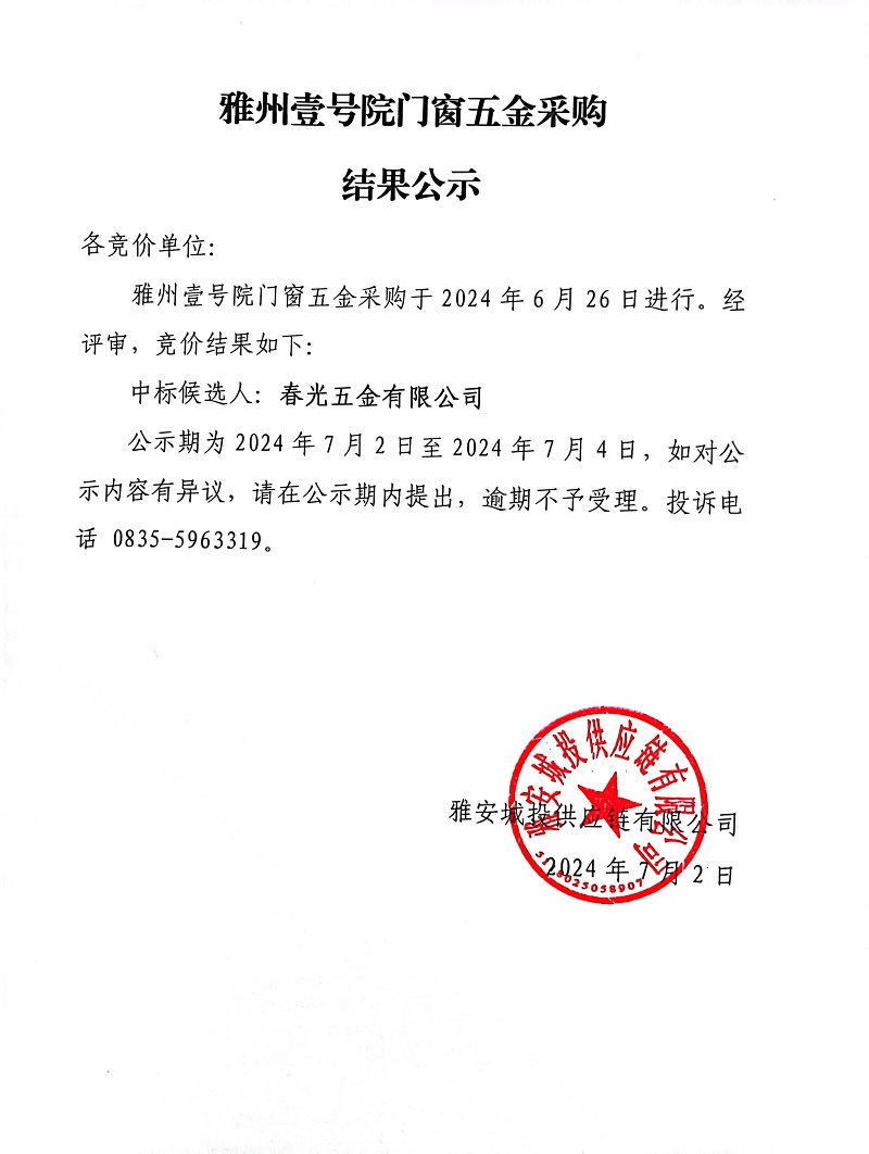 雅州壹號院門窗五金采購結果公示