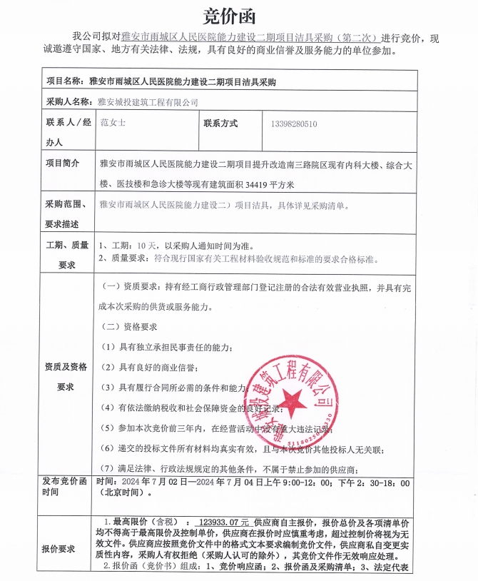 雅安市雨城區(qū)人民醫(yī)院能力建設(shè)二期項目潔具采購(第二次)競價公告