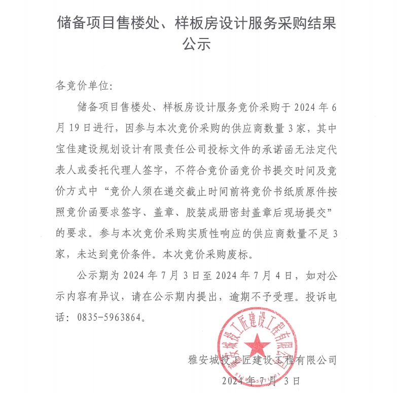 儲(chǔ)備項(xiàng)目售樓處、樣板房設(shè)計(jì)服務(wù)采購結(jié)果公示