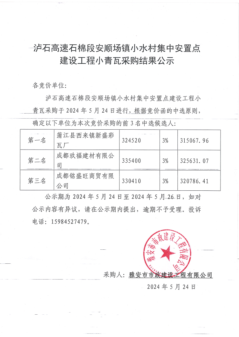 瀘石高速石棉縣段安順場(chǎng)鎮(zhèn)小水村集中安置點(diǎn)建設(shè)工程小青瓦采購(gòu)結(jié)果公示