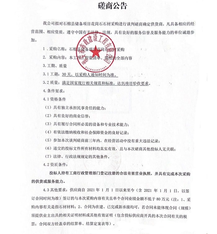 石棉縣儲備項(xiàng)目花崗石石材采購磋商公告