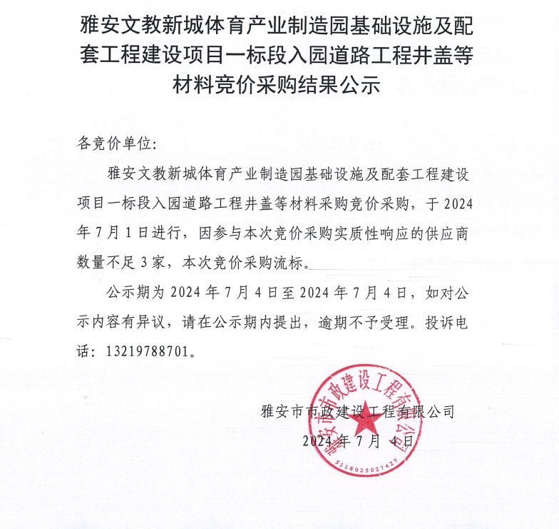 雅安文教新城體育產(chǎn)業(yè)制造園基礎設施及配套工程建設項目一標段入園道路工程井蓋等材料競價采購結果公示