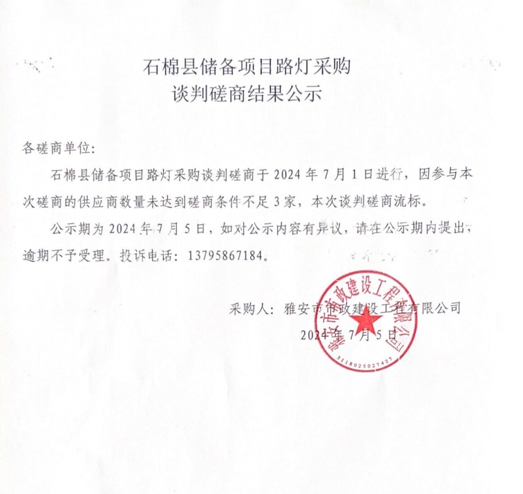 石棉縣儲備項目路燈采購談判磋商結(jié)果公示