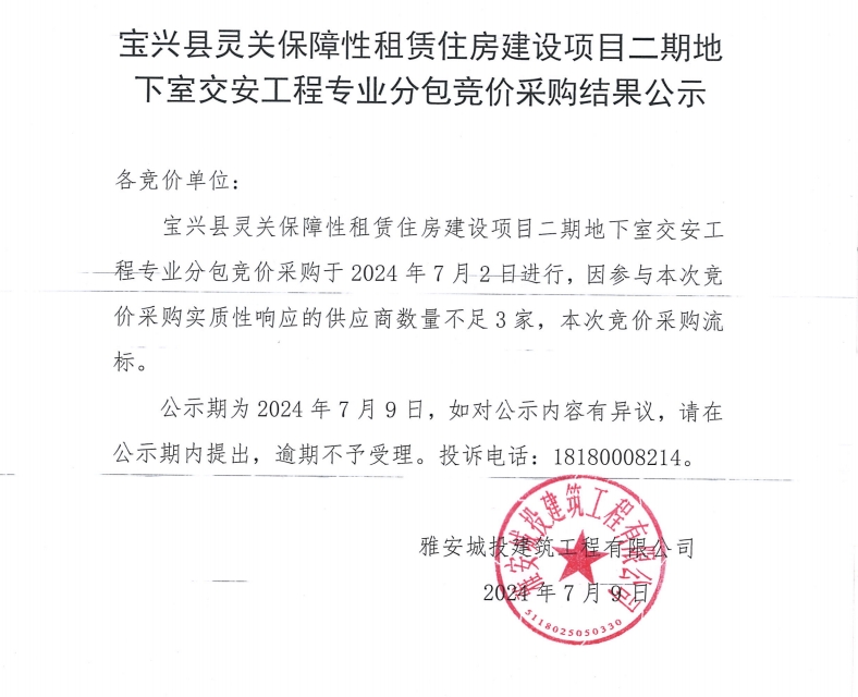 寶興縣靈關(guān)保障性租賃住房建設(shè)項(xiàng)目二期地下室交安工程專業(yè)分包競(jìng)價(jià)采購結(jié)果公示