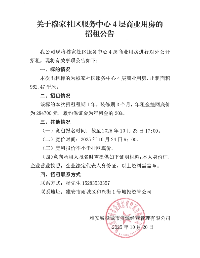 關(guān)于穆家社區(qū)服務(wù)中心4層商業(yè)用房的招租公告