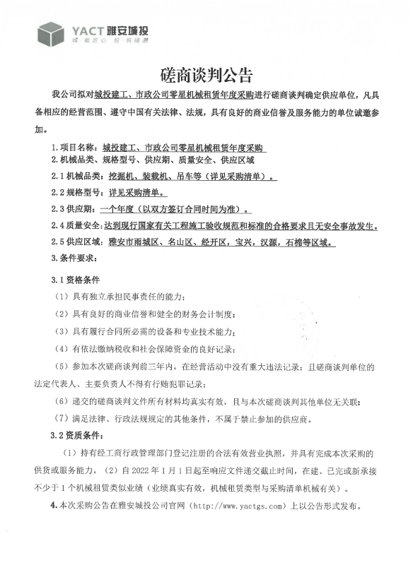 城投建工、市政公司零星機械租賃年度采購磋商談判公告