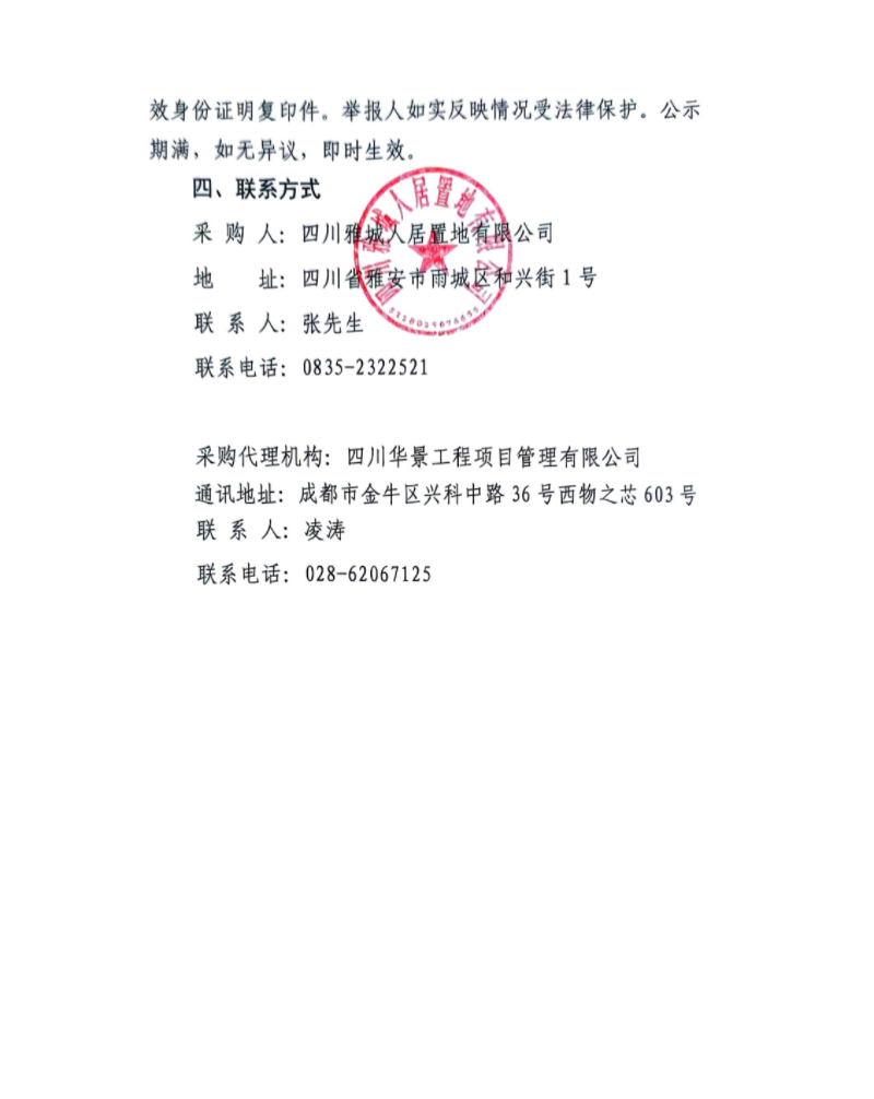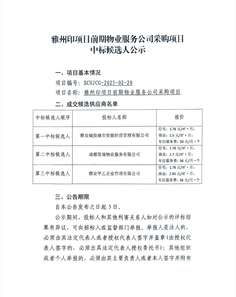 雅州印項目前期物業(yè)服務公司采購項目中標候選人公示