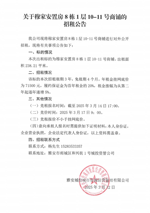關于穆家安置房8棟1層10-11號商鋪的招租公告