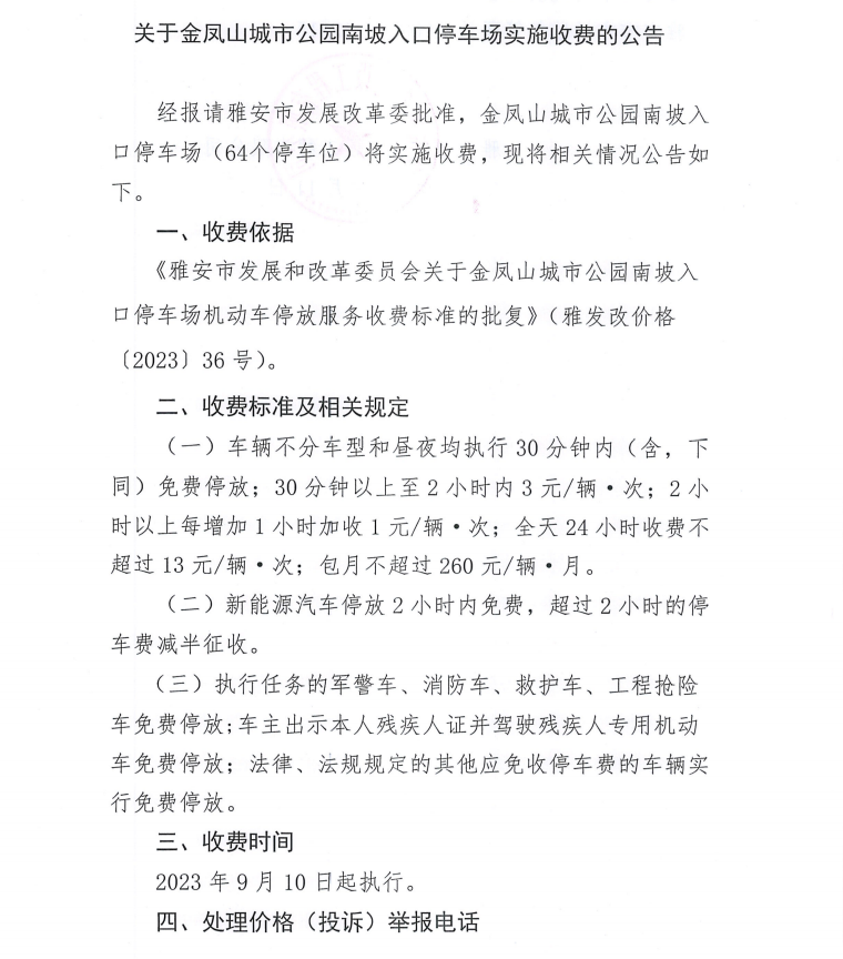 關(guān)于金鳳山城市公園南坡入口停車場實施收費的公告