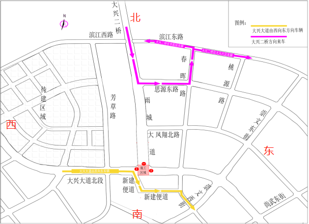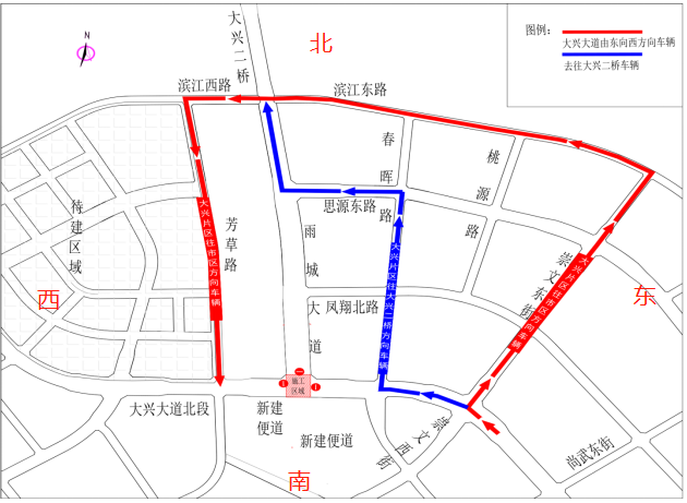 2.大興老場(chǎng)鎮(zhèn)片區(qū)前往大興二橋方向車(chē)輛:老場(chǎng)鎮(zhèn)-春暉路-思源東路-大興二橋