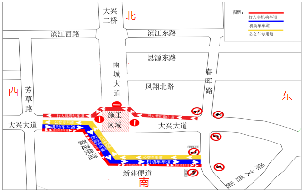 新建便道僅供社會(huì)車(chē)輛由西向東通行(公交車(chē)除外),南側(cè)行人非機(jī)動(dòng)車(chē)由便道通行;由東向西車(chē)輛繞行,行人非機(jī)動(dòng)車(chē)由北側(cè)預(yù)留通道通行。
